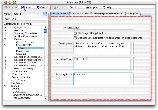 ActivitiesThe Activity Module is where you manage your organization's activities. People who participate in activities do so for a specified period of time and hold a particular position. When a person is through with an activity, you do not delete their participation, you simply give them an end date. In this way, you can maintain historical records. Activities can be grouped together in a tree structure, in much the same way as you organize the files on your computer. One way to organize them would be by the reporting structure in your organization. Another way might be by similar function. The tabs across the top of the screen are: